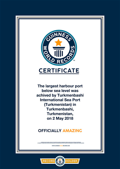 Türkmenbaşynyň täze gurlup ulanylmaga berlen Halkara deňiz porty deňiz derejesinden aşakda ýerleşen iň uly deňiz porty hökmünde 2018-nji ýylyň 2-nji maýynda Ginnesiň rekordlar kitabyna girizildi.