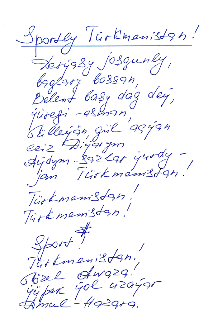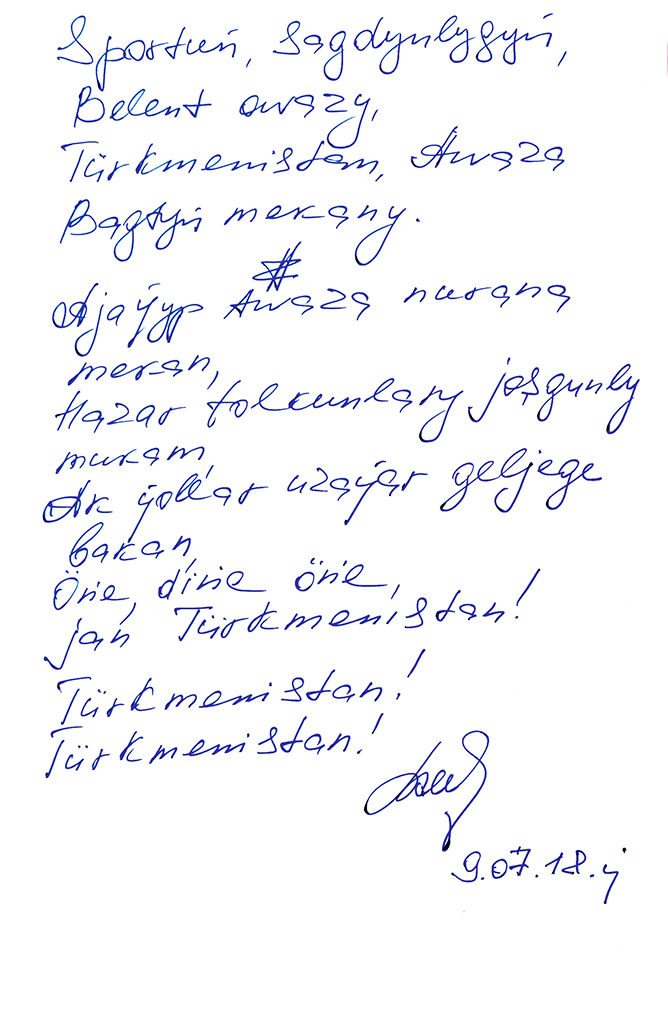 Hormatly Prezidentimiz özüniň sazlaşykly ritmlerden we kapiýalardan hem-de örän çuň pelsepewi pikirlerden ybarat täze ýazan «Sportly Türkmenistan» atly poetik eserinde: «Sport! Türkmenistan! Gözel Awaza! Ýüpek ýol uzaýar Amul — Hazara»  diýmek bilen, Bitarap Diýarymyzda gysga döwrüň içinde müňýyllyklara barabar gazanylan ägirt uly zähmet we ruhy ýeňişleri şygyr setirlerinde ussatlarça beýan etmegi başarypdyr.