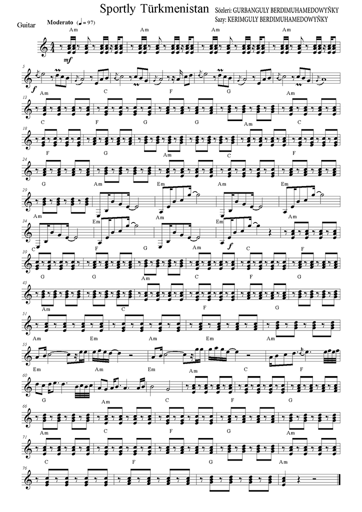 Hormatly Prezidentimiz Gurbanguly Berdimuhamedow gitarada ussatlarça sazandalyk eden agtygy Kerimguly bilen saz eseriniň üstünde işlemegini tamamlap, türkmen we iňlis dillerinde öňde boljak «Amul — Hazar 2018» halkara awtorallisine, ýurdumyzyň sportunyň gazananlaryna, tebigatymyzyň täsin gözelligine bagyşlanan «Sportly Türkmenistan» atly täze aýdymy ýerine ýetirdiler. Häzirki döwrüň äheňinde döredilen bu aýdym gojaman Hazaryň ajaýyp türkmen kenarynda belent heňde ýaňlandy.